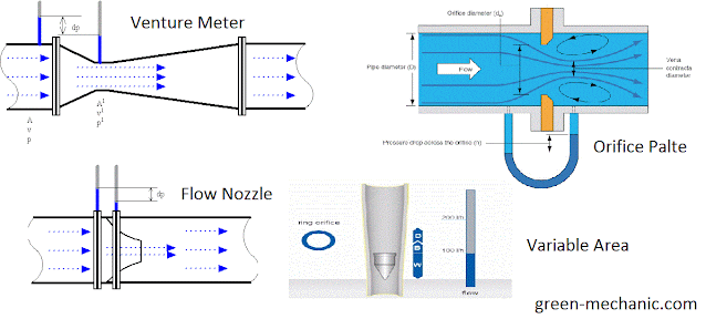 Medidores diferenciales: relacionan el flujo con la caída de presión en una variación provocada en el fllujo. \[ Q=k\sqrt{\Delta P} \]